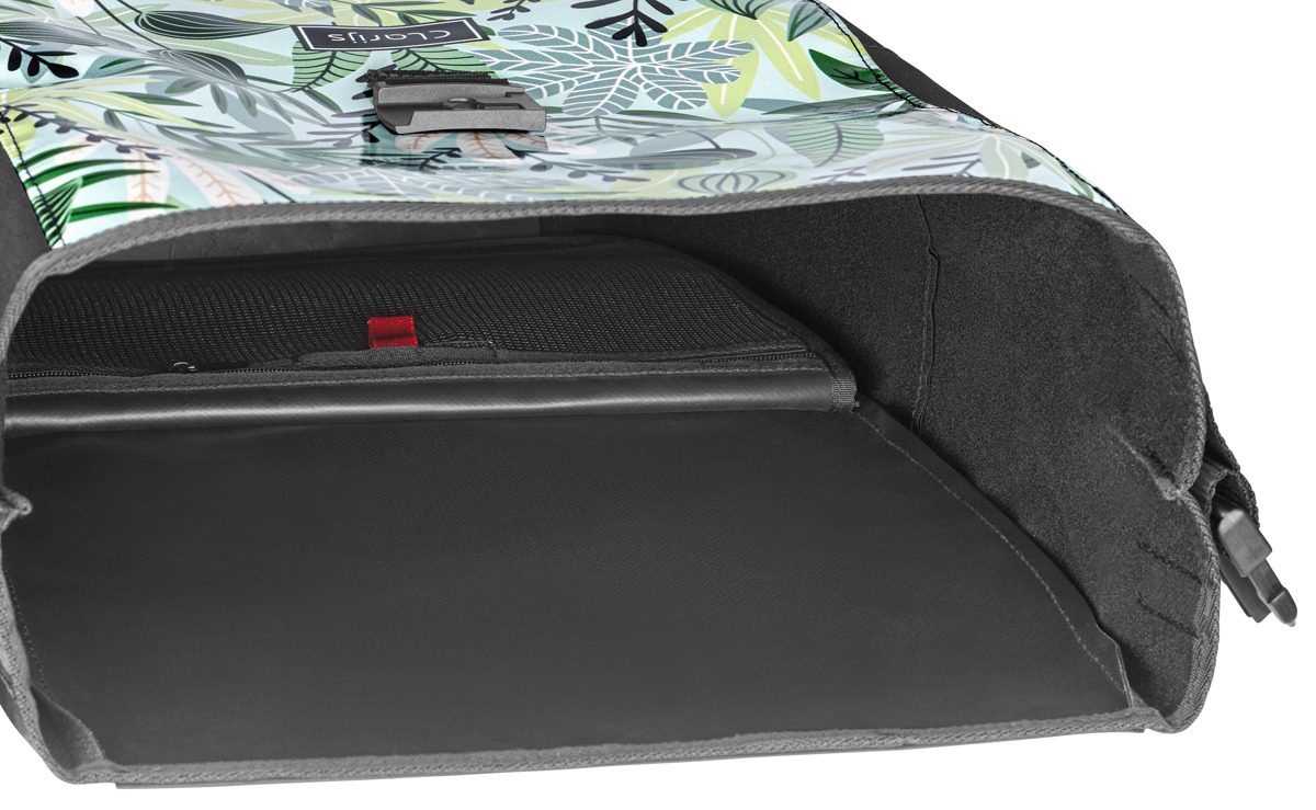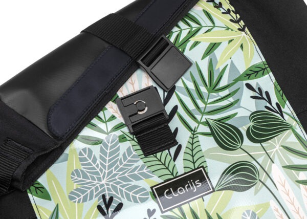 De Clarijs Solobag Green Leaves is ideaal voor iedereen die een ruime, waterdichte fietstas nodig heeft. Het ruime hoofdvak met binnenzak en verstevigde achterplaat, sluit met een praktische en waterbestendige rolsluiting. Deze sluiting is uitgevoerd met een magnetische FIDLOCK gesp.
