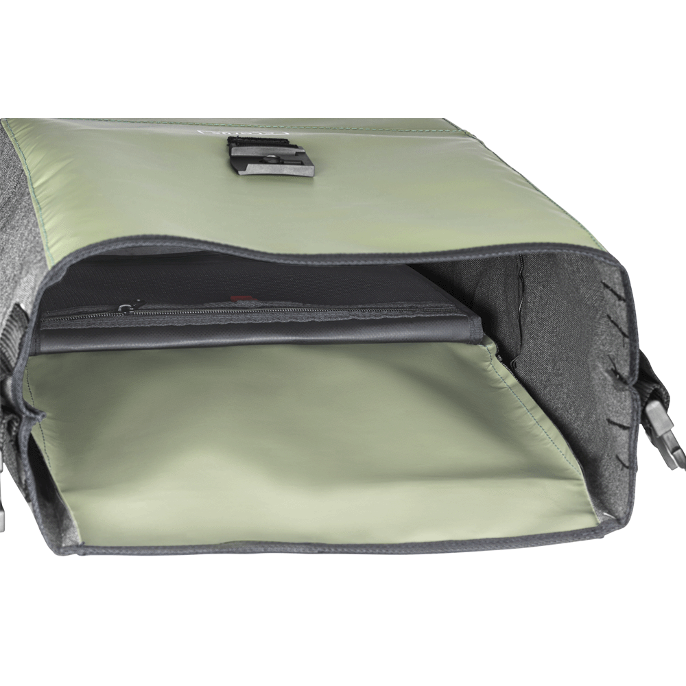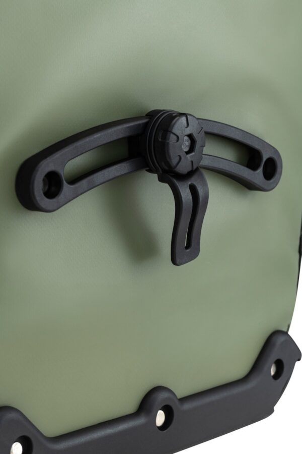 De enkele fietstas Mat Olive is enorm geschikt als fietstas. Deze draagbare fietstas kan zowel links als rechts aan jouw fiets worden bevestigd. De tas is met uitzondering van de haken en gespen volledig gerecycled. We recyclen PVC en gecoat Acryl door de waste en cut-outs van onze bakfiets regenhoezen te gebruiken.