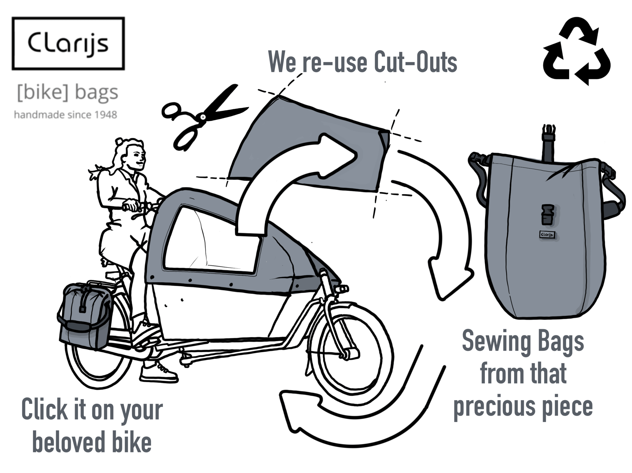 - Deze draagbare fietstas is gemaakt van het productieafval van onze bakfiets regenhoezen. De materialen die we gebruiken zijn gecoat acryl en PVC.