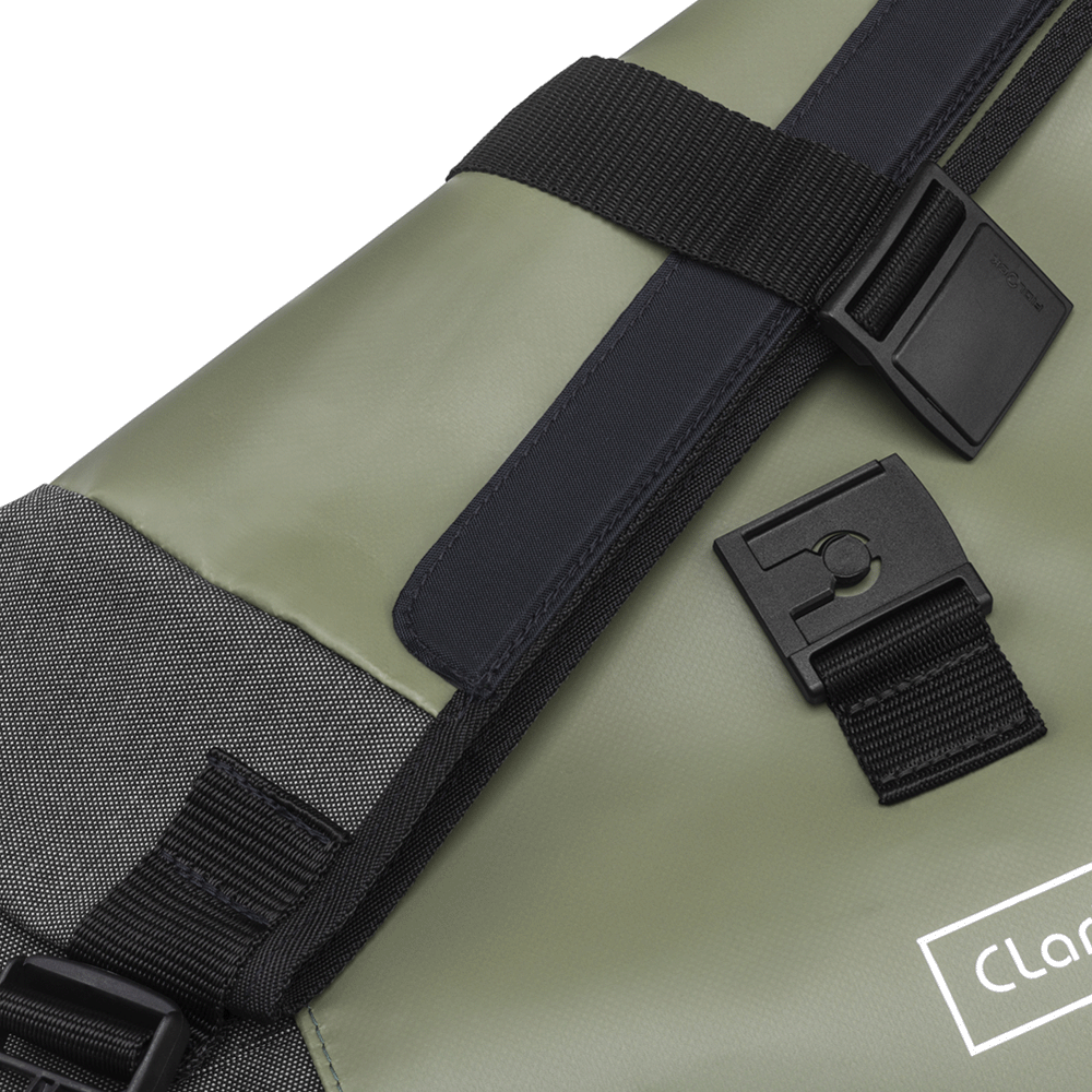 De Clarijs Solobag Mat Olive is ideaal voor iedereen die een ruime, waterdichte fietstas nodig heeft. Het ruime hoofdvak met binnenzak en verstevigde achterplaat, sluit met een praktische en waterbestendige rolsluiting. Deze sluiting is uitgevoerd met een magnetische FIDLOCK gesp.